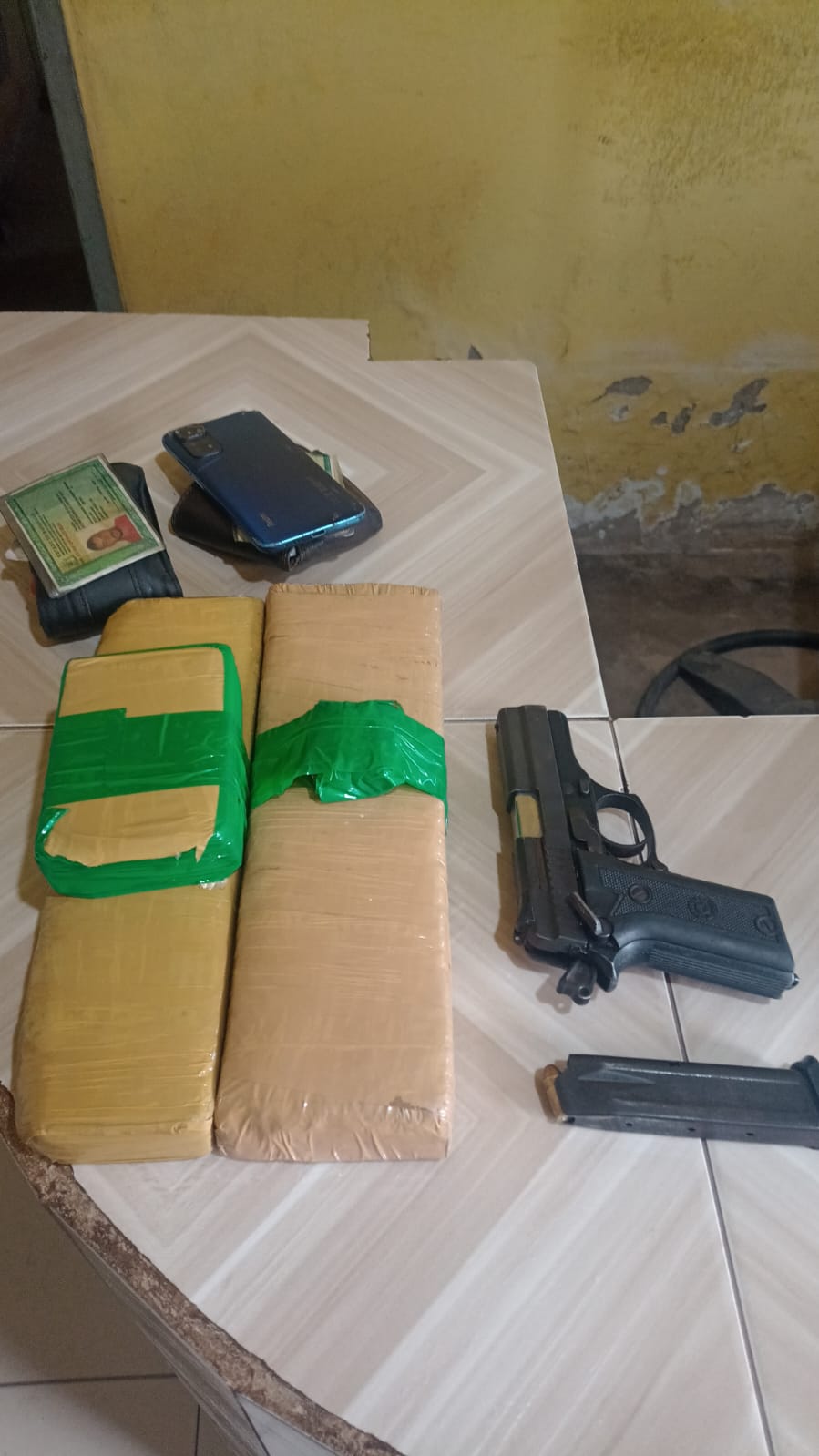 De acordo com a PM, a guarnição recebeu informações de um comerciante sobre a atitude suspeita de dois indivíduos que haviam passado pelo seu estabelecimento. A equipe iniciou buscas e, ao abordar uma motocicleta Yamaha Factor azul, encontrou com os suspeitos os tabletes de droga, além da arma de fogo, um carregador e 11 munições intactas.