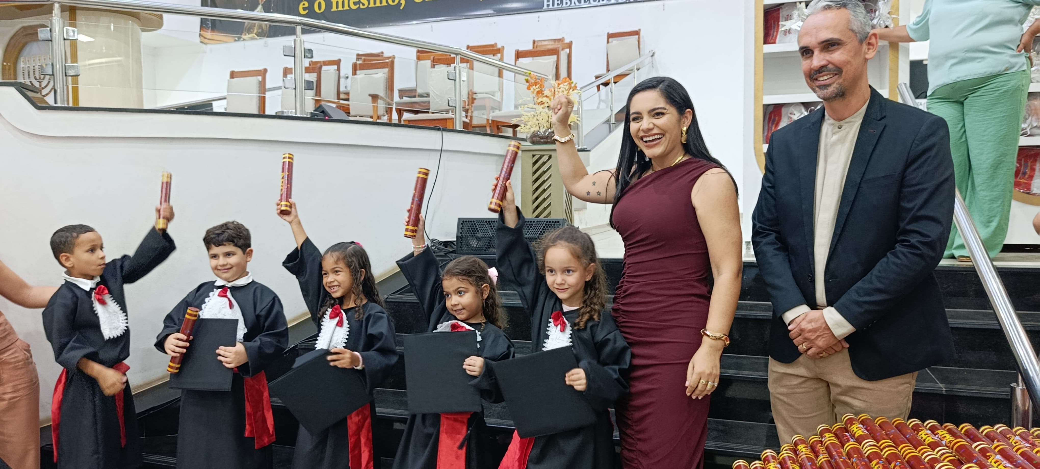 O evento foi marcado por muita emoção e alegria, celebrando uma etapa fundamental no processo de alfabetização das crianças. A formatura contou com toda uma estrutura preparada especialmente para os pequenos, incluindo decoração temática, cerimônia oficial e até baile de formatura, garantindo às crianças uma experiência completa, digna da importância desse momento.