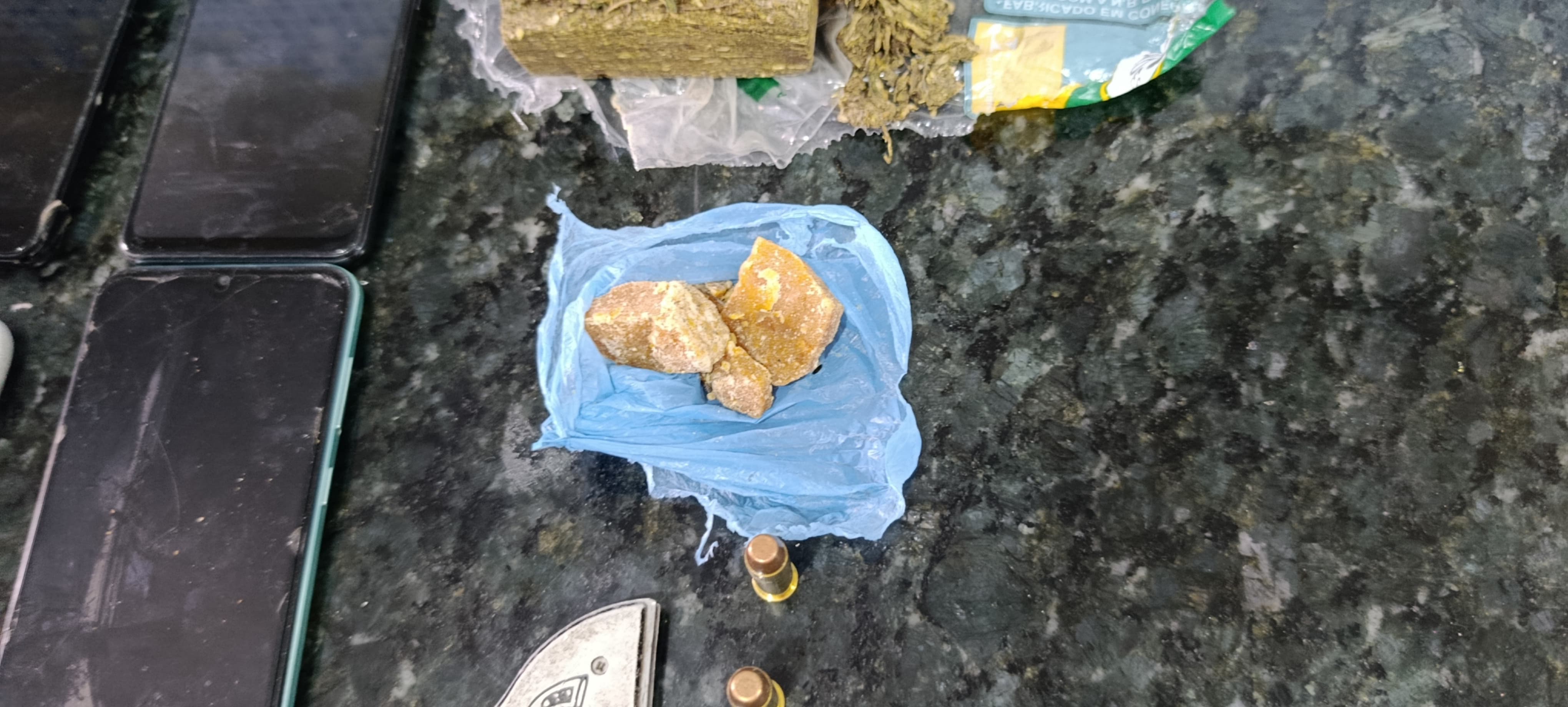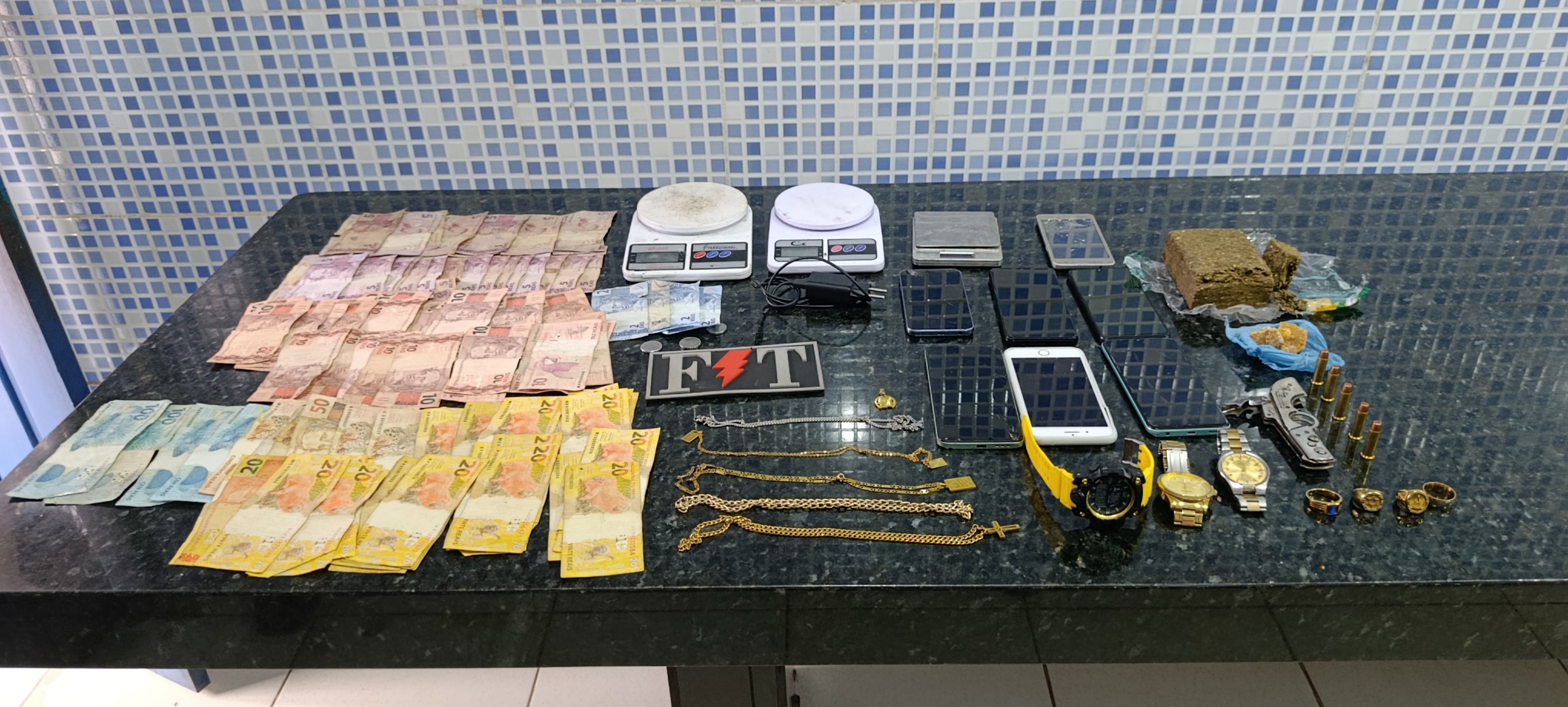 Durante a ação, os policiais localizaram um imóvel utilizado como ponto de apoio para atividades criminosas. No local, foram apreendidas munições, substâncias semelhantes à maconha e a outras drogas, balança de precisão, embalagens para acondicionamento de entorpecentes, dinheiro trocado, aparelhos celulares e joias.
